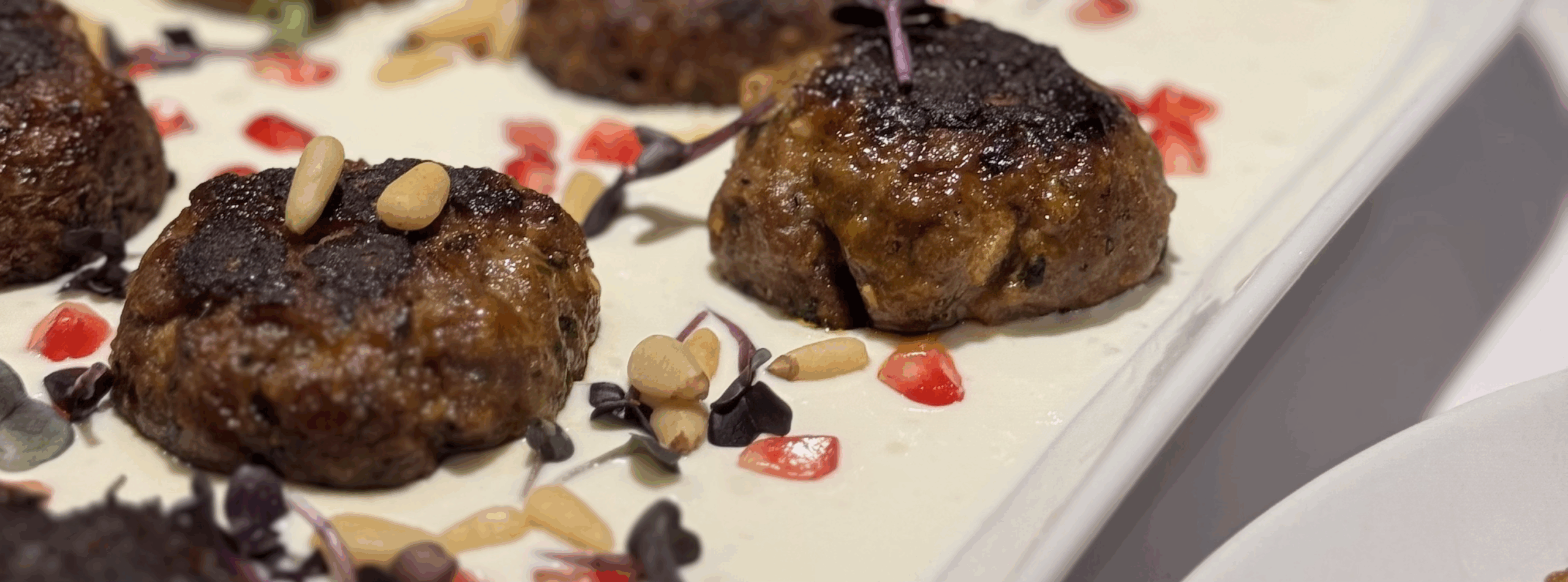 5. Anrichten: Sauce auf einer Platte verstreichen, Fleischbällchen daraufsetzen und mit Granatapfelkernen, Pinienkernen, Kräutern und etwas Olivenöl garnieren.
