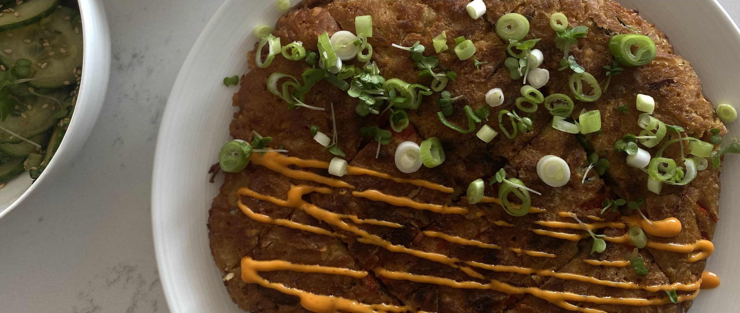 4. Anrichten: Pancakes auf Teller legen, mit der Hot Mayo beträufeln oder als Dip servieren. Optional mit Sesam und gehacktem Koriander oder Frühlingszwiebeln garnieren. In Quadrate schneiden (siehe Bild) und genießen!